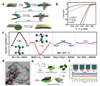 The catalytic performance of bare bimetallic nanosheets can be further improved by heteroatom doping with additional catalytic sites and altered the electronic structure. Fan et al. introduced H atoms into bimetallic RhPd nanosheets, resulting in a prominently low overpotential of 40 mV and predominant stability for over 10 h at 100 mA/cm2 in 1 mol/L KOH solution. The confined H stabilizes the RhPd nanosheets bimetallene and enhances the activity (Fig. 5c) [71]. Mahmood et al. prepared ultrathin porous PtAgCo nanosheets by doping Co into PtAg alloy. The Co atoms change the electronic structure of the PtAg alloy and contribute to the desorption of Had by downshifting the Fermi level of PtAg (Fig. 5d) [72].