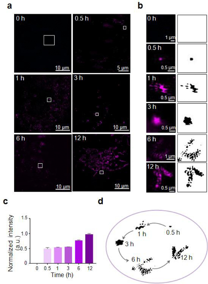 | Fig. 1. Super-resolution visualization of Cy5-Dextran distribution in living cells. (a) Fluorescence images of HeLa cells incubated with Cy5-Dextran (10 μmol/L, λex = 640 nm) for 0, 0.5, 1, 3, 6, and 12 h. (b) Enlargement of single Cy5-Dextran puncta outlined in (a). (c) The normalized fluorescence intensity of Cy5-Dextran at various time points. (d) Schematic representation of Cy5-Dextran staining in lysosomes and mitochondria in living cells over time. | |