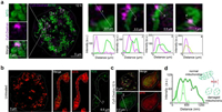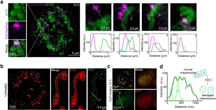 | Fig. 3. Cy5-Dextran localized to the mitochondria triggers a pro-apoptosis event. (a) The interaction between Cy5-Dextran (λex = 640 nm) and mitochondria after a 12 h incubation period. Zoom-in images are of areas surrounded by the white rectangles. (b) The ROS levels detected in untreated and Cy5-Dextran-treated (12 h) HeLa cells (c) Cells were stained with MTR (λex = 561 nm) for 0.5 h and ROS commercial green probe for 0.5 h. The white solid square indicates where fluorescence intensity profiles shown in (d) were measured. (d) Intensity profiles indicating that HeLa cells incubated with Cy5-Dextran for 12 h can increase mitochondria ROS levels, accelerating mitochondria fission. | |
