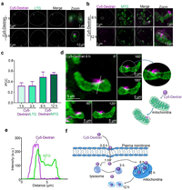 For the fibrous and rod-shaped distribution pattern demonstrated by Cy5-Dextran incubation between 6 and 12 h (Fig. 1a), we further verified whether Cy5-Dextran was localized within the mitochondria. A commercial mitochondrial probe (Mito-Tracker Green, MTG) and Cy5-Dextran were used to co-stain HeLa cells. The results showed that Cy5-Dextran was localized to the MTG-labeled mitochondria zones during Cy5-Dextran incubation for 6 and 12 h (Figs. 2b and c). Moreover, some normal fibrous-like mitochondria became swollen or fragmented after Cy5-Dextran incubation for 12 h (Fig. 2b). To further observe and investigate Cy5-Dextran entering the mitochondria at 6 h, we captured 3D images from different rotation angles around a solid white line (Fig. 2d, 0–180°). Analysis of these images revealed that Cy5-Dextran had contacted the mitochondria at 6 h (Fig. 2e) and wrapped around their surface like a "concealed button." These results supported the fact that Cy5-Dextran incubation for 6 and 12 h involved localization of the molecule to the mitochondria. Altogether, we found that Cy5-Dextran exhibited a different organelle distribution (lysosomal or mitochondrial) in a time-dependent manner (Fig. 2f).