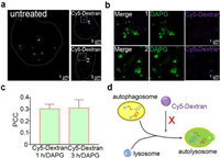 | Fig. 4. SIM visualization of the influence of Cy5-Dextran localization on autophagy. (a) Cells were treated with Cy5-Dextran (λex = 640 nm) for 0, 1, and 3 h and then stained with the autophagosome dye DAPGreen (λex = 488 nm) for 0.5 h. (b) Zoom-in images of regions of interest in the white rectangle from (a). (c) The co-localization value (PCC) for DAPGreen and Cy5-Dextran at 1 and 3 h of incubation. (d) Schematic representation of how Cy5-Dextran subcellular distribution is independent of the autophagosome. | |