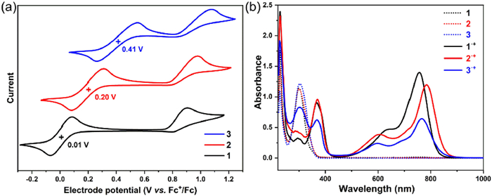 The redox properties of triphenylamines 1–3 were then evaluated by cyclic voltammetry (CV) in CH2Cl2 at 298 K with 0.1 mol/L tetrabutylammonium hexafluorophosphate as supporting electrolyte (Fig. 1a). Triphenylamines 1–3 all exhibited two oxidation waves, and the half-wave potentials (E1/2ox, potentials are referred vs. Fc/Fc+) of 1–3 were determined to be +0.01 V, +0.20 V, and +0.41 V, respectively. No reduction wave was observed for 1–3. The oxidation potentials significantly decreased in an order from 3, 2 to 1, indicating that the 3, 5-di-tert-butyl-4-anisyl group could remarkably reduce the oxidation potential of TPA core. Notably, in all cases, the first oxidation wave was reversible while the second one was irreversible, implying the formation of radical cation was feasible but might be difficult in achieving the dication species (vide infra).