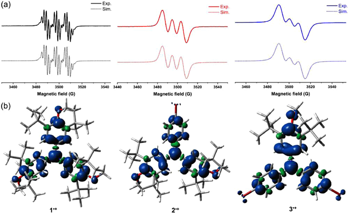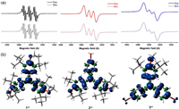 | Fig. 2. (a) EPR spectra and the simulations via EPR simulation programs of 1·+−3·+ in CH2Cl2 solution. (b) Spin density distributions of 1·+−3·+ at the UB3LYP/6–311G(d, p) level of theory. | |