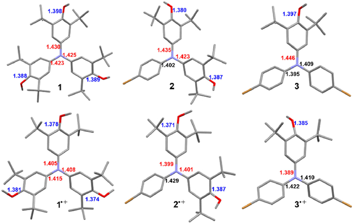 The structures of 1–3 and 1·+−3·+ were unambiguously confirmed by X-ray crystallographic analysis (Fig. 4). Their single crystals revealed the distinct propeller-shaped configuration of TPA core, wherein the para-position on anisyl rings were properly protected by the bulky tert-butyl group. Such configuration and the kinetic protection reasonably elucidated the increased stability of TPA radical cation consisting of more 3, 5-di-tert-butyl-4-anisyl groups. Interestingly, the N-C bonds (red numbers in Fig. 4) between the N atom and anisyl group in radical cation species became consistently shorter than in the neutral species. Besides, such N-C bond lengths were also much shorter than those between the N atom and para-bromophenyl group (black numbers in Fig. 4). In addition, the C-O bond lengths (blue numbers in Fig. 4) were also becoming shorter than in the neutral species. Therefore, the bond length analysis results might provide insight into the electronic structures of the para-methoxy substituted TPA radical cation, i.e., its electronic structure was more like a resonance hybrid wherein spin densities could be efficiently delocalized on the anisyl rings (Scheme 1). These findings were also consistent with the aforementioned spin density distributions of 1·+−3·+ and the reported theoretical results [46].