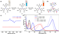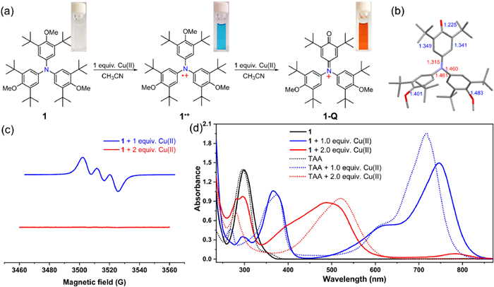 | Fig. 5. (a) Reaction of 1 with one and two equivalent Cu(ClO4)2•6H2O in acetonitrile. Insert are the photos of the solutions of 1 (colorless), 1·+ (blue) and 1-Q (red). (b) X-ray crystallographic structure of 1-Q (ClO4− anion and hydrogen were omitted for clarity). (c) EPR spectra of 1 after adding 1 equiv. (blue line) and 2 equiv. (red line) Cu(ClO4)2•6H2O in acetonitrile. (d) UV–vis-NIR spectra of 1 and TAA, and their oxidation species in the presence of Cu(ClO4)2•6H2O. | |