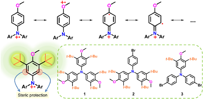| Scheme 1. The major resonance structures of TPA radical cation consisting of 4-anisyl group, the proposed steric protecting strategy and the target molecules in this work. | |