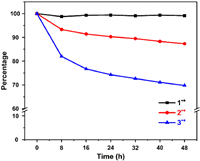 In order to investigated the stability of the three triphenylamine radical cations 1·+−3·+, we measured the time-dependent absorption spectra of 1·+−3·+ in CH2Cl2 (Fig. 3). Radical cations 1·+ with three 3, 5-di-tert-butyl-4-anisyl was found to be very stable after 48 h in ambient environmental conditions because its absorbance in CH2Cl2 solution remained almost constant (Fig. 3 and Fig. S1 in Supporting information). In contrast, radical cations 2·+ and 3·+ exhibited obvious decrease in their absorbances in CH2Cl2, especially for 3·+ that was found to remain only 70% after 48 h (Fig. 3, Figs. S2 and S3 in Supporting information). Therefore, the introduction of more bulky 3, 5-di-tert-butyl-4-anisyl groups could significant enhance the stability of the TPA radical cations, mainly due to the effectively kinetic protection, which is also consistent with our recent study [48].