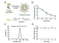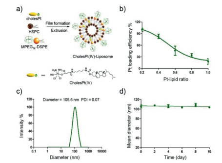 | Fig. 1. Schematic illustration and characterizations of cholesPt(IV)-functionalized liposome. Liposomes integrated by cholesPt(IV) were prepared by sequential film hydration and extrusion approach. (a) Anchor of cholesPt(IV) into the lipid bilayer of liposome to yield CholesPt(IV)-Liposome. (b) Integration percentage of cholesPt(IV) as a function of varying feed ratios of cholesPt(IV)/lipids. (c) Representative DLS result of cholesPt(IV) integrated liposome at the identified feed ratio of cholesPt(IV)/lipid of 0.4:1. (d) Colloidal stability of CholesPt(IV)-Liposome (at the identified feed ratio of cholesPt(IV)/lipid ratio of 0.4:1). The size derivation of the formulated liposome was monitored by DLS measurement. | |