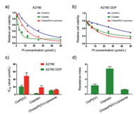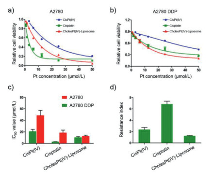 | Fig. 2. In vitro toxicity of diverse platinum formulations of cisPt(IV), cisplatin and CholesPt(IV)-Liposome in A2780 and A2780 DDP cells. Cell viability of A2780 (a) and A2780 DDP (b) under treatment of cisPt(IV), cisplatin and cholesPt-NPs for 72 h. The IC50 of cisPt(IV), cisplatin and CholesPt(IV)-Liposome on A2780 and A2780 DDP cells at 72 h were shown in (c). (d) The drug resistance fold of each platinum drug formulation was calculated by the ratio of IC50 at A2780 DDP to IC50 at A2780. | |