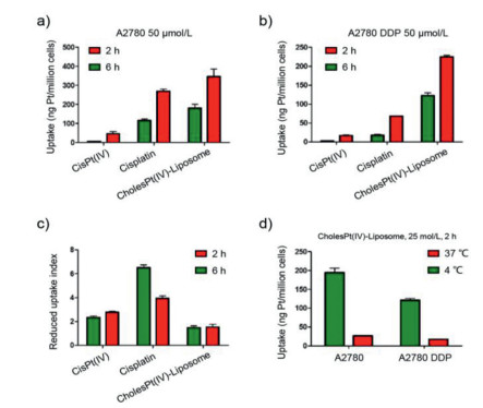 | Fig. 3. Impact of drug resistance on cellular uptake of diverse platinum derivatives. Quantification of intracellular platinum in A2780 (a) and A2780 DDP (b) after 2 and 6 h drug incubation with cisplatin, cisPt(IV) and CholesPt(IV)-Liposome. The uptake-reducing index was summarized in (c). The uptake-reducing was defined as the ratio of platinum uptake at A2780 to platinum uptake at A2780 DDP. (d) Cellular uptake activity of CholesPt(IV)-Liposome at 37 and 4 ℃. | |