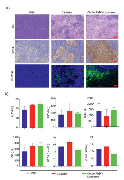 Hematoxylin and eosin (H & E), TdT-mediated dUTP Nick-End Labeling (TUNEL)-staining, and immunofluorescence analysis of tumor tissues results revealed that CholesPt(IV)-Liposome could cause more necrosis and apoptosis, as well as damaged DNA strands (Fig. 5a), which demonstrated that CholesPt(IV)-Liposome had superior antitumor effects. In addition, there was no obvious histological toxicity in main organs (heart, liver, spleen, lung, and kidney) and blood biochemistry, which indicated the excellent biocompatibility of CholesPt(IV)-Liposome (Fig. 5b and Fig. S9 in Supporting information).
