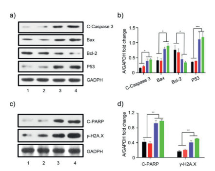 We further explored the antitumor mechanism of CholesPt(IV)-Liposome by western blotting. Compared with cisplatin or platinum(IV), the CholesPt(IV)-Liposome-treated cells exhibited marked up-regulation of apoptosis-related proteins, such as cleaved caspase 3 (abbreviated as C-Caspase 3), P53, Bax, as well as decreased anti-apoptosis protein Bcl-2 (Figs. 6a and b). Compared with cisplatin and platinum(IV), the CholesPt(IV)-Liposome could lead to increased expression of cleaved PARP (abbreviated as C-PARP) and γ-H2A.X, which suggested that CholesPt(IV)-Liposome could effectively cause DNA damages (Figs. 6c and d).