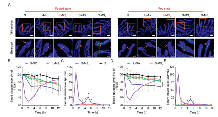 | Fig. 4. In vivo intestinal villus absorption of insulin-loaded capsules and pharmacodynamic and pharmacokinetic studies of insulin-loaded capsules. (A) Intestinal absorption of insulin in fasting rats and in rats fed freely. (Up) Scale bar, 100 μm. (Down) Scale bar, 50 μm. Blood glucose levels of the diabetic rats following the oral administration of insulin-loaded capsules or an insulin solution (S, 30 IU/kg) or the subcutaneous injection of the insulin solution (S-SC, 5.0 IU/kg) in fasting rats (B) and in rats fed freely (D). Serum insulin levels of the diabetic rats following administration of the same formulations in fasting rats (C) and in rats fed freely (E) (mean ± SD, n= 3). *P < 0.05, compared with S-MS1. | |