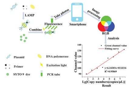 At present, there are many platforms for detecting the products of LAMP, such as colorimetry, turbidimetry, gel electrophoresis and fluorimetry [30-32]. The detection principle for gel electrophoresis is that DNA molecules migrate under the action of electric field. Although gel electrophoresis is highly specific, it is complex, time-consuming and energy consuming, and it is also not quantitative. The detection principle for colorimetry is to observe the color change of reagent solution [33]. The operation is simple and can be observed by naked eye. However, it is influenced by subjective factors. The detection principle for turbidimetry method is to observe the formation of pyrophosphatase precipitation. Although it has low cost and simple operation, it has low sensitivity. Fluorescence method can be used for quantitative detection, but the structure of equipment and instrument is complex and the cost is high. Therefore, we developed an image method based on SYTO9 to detect the products of LAMP. SYTO9 is a fluorescent nucleic acid stain that is widely used in microbiology, particularly for fluorescence microscopy and flow cytometry analyzers [34]. SYTO9 can be used for detection of LAMP products that can change color [35]. We then used the mobile phone to take photos about the color change after reaction [36]. Python is a high-level interpreted programming language, which is widely recognized for being easy to learn, yet still able to harness the power of systems-level programming languages when necessary [37]. Finally, the images were processed by the designed program based on Python. The results can be obtained immediately through image processing, saving the waiting time. The results can also be used for semi-quantitative analysis of LM, which provides a new detection idea for the laboratory. The chief flowchart of this experiment is shown in Fig. 1. The materials used above are shown in Support information.