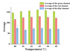 In this paper, color recognition was carried out through image processing, and LAMP reaction temperature was further optimized. LAMP reaction was performed at the six temperatures (60 ℃, 61℃, 62 ℃, 63 ℃, 64 ℃, and 65 ℃). Fig. 2 shows the results of three channel values obtained through image processing after repeated experiments at the above six temperatures (Table S2 in Supporting information). As can be seen from Fig. 2, when the temperature was 63 ℃, the average values of red channel and green channel reached maximum values, which were 161.3327 and 130.5381 respectively. Therefore, the detection method based on SYTO9, with the help of smartphone, took 63 ℃ as the reaction temperature for subsequent experiments.