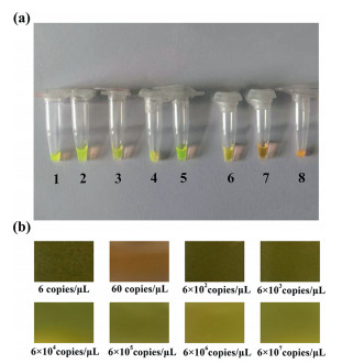 | Fig. 3. The sensitivity of the method was analyzed. (a) Color changes at different copy numbers. (b) The images of a color change with different copy numbers taken by the smartphone. | |