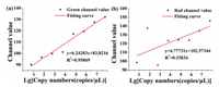 | Fig. 4. By comparing the fitting degree of the two channel values, the best channel was selected for the semi-quantification of LM. (a) The fitting result for green channel value. (b) The fitting result for red channel value. | |