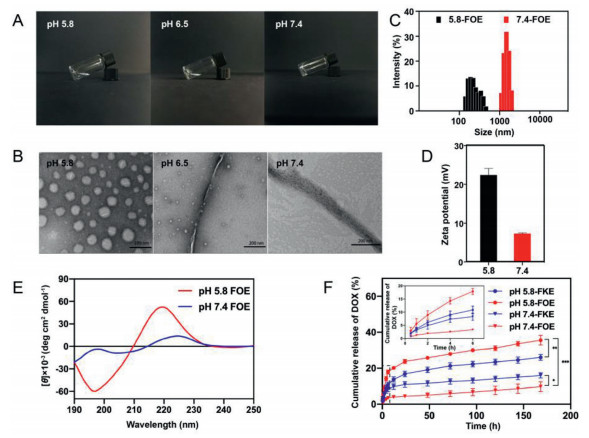 | Fig. 1. Characterization of FOE octapeptide under different pH conditions. (A) Appearance of FOE solution (15 mg/mL); (B) TEM images of blank FOE hydrogel (0.10 wt%), scale bar: 200 nm; (C) Dynamic light scattering (DLS) and (D) zeta potential curves of FOE hydrogels; (E) CD spectrum of blank FOE; (F) Cumulative release of DOX from FKE and FOE hydrogels. One-way ANOVA, mean ± SD, *P < 0.05, ** P < 0.01 and *** P < 0.001, n = 3. | |