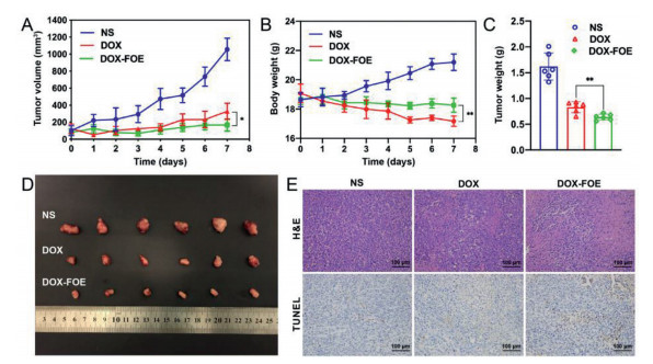 | Fig. 4. In vivo anti-tumor assay of FOE hydrogel. Tumor volume (A) and body weight (B) change curve of 4T1 tumor-bearing BALB/c mice treated with NS, DOX and DOXFOE within 7 days; Average weight (C) and photographs (D) of tumors harvested from 4T1 tumor-bearing BALB/c mice treated with NS, DOX and DOX-FOE 7 days after administration; (E) H & E staining and TUNEL assay of tumor sections harvested from 4T1 tumor-bearing BALB/c mice at 7 days posttreatment, scale bar: 100 μm. One-way ANOVA, mean ± SD, *P < 0.05, ** P < 0.01 versus DOX. | |