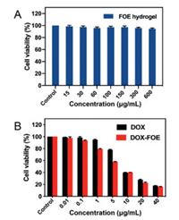 | Fig. 3. (A) Cell viability of HUVECs co-incubated with FOE octapeptide hydrogel (n = 6); (B) Cell viability of 4T1 cells co-incubated with free DOX or DOX-loaded hydrogel (n = 6). | |