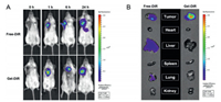 | Fig. 5. In vivo biodistribution of free-DiR and Gel-DiR in 4T1-bearing mice. (A) In vivo fluorescence images of tumor-bearing mice at different times after peritumoral administration of free-DiR and Gel-DiR; (B) Ex vivo fluorescence images of tumors and major organs at 24 h after peritumoral administration, including tumor, heart, liver, spleen, lung, and kidney. DiR as the fluorescent probe. | |