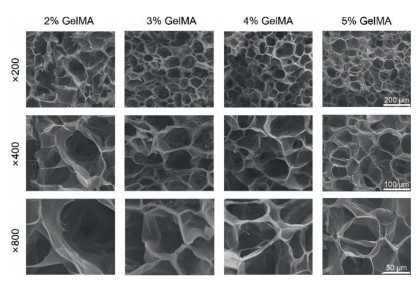 | Fig. 1. Scan electron micrograph images of GelMA cryogels with different concentrations. Scale bars (from up to down): 200, 100, and 50 μm. | |