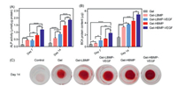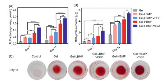 | Fig. 2. (A) ALP activity and (B) BCA protein content of rBMSCs after incubated with Gel, Gel-LBMP, Gel-LBMP-VEGF, Gel-HBMP, and Gel-HBMP-VEGF scaffolds for 7 and 14 days, respectively. (C) Optical macro images of alizarin red staining of rBMSCs cultured on Gel, Gel-LBMP, Gel-LBMP-VEGF, Gel-HBMP, and Gel-HBMP-VEGF scaffolds for 14 days. | |