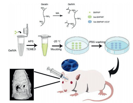 | Scheme 1. Schematic illustration of bioactive gelatin cryogels with BMP-2 biomimetic peptide and VEGF for synergistically induced osteogenesis. | |