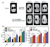 | Fig. 3. (A) Micro-CT 3D reconstruction images of newly bone tissues at 2, 4 and 8 weeks after implantation of Gel, Gel-BMPMP, and Gel-BMPMP-VEGF scaffolds into rat cranial defects. (B) Proportion of new bone formation (BV/TV) and (C) total bone mineral density (total BMD) were calculated to analyze the effect of Gel, Gel-BMPMP, and Gel-BMPMP-VEGF scaffolds on repairing bone defects. | |