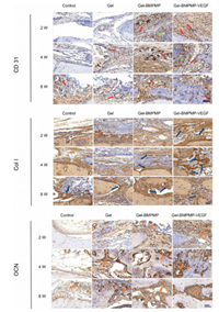 | Fig. 4. The immunohstochemical staining specific for anti-CD 31, Col Ⅰ and OCN images of the bone regeneration tissues in different groups at 2, 4 and 8 weeks after surgery. | |
