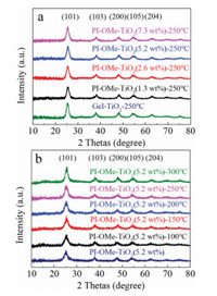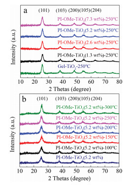 | Fig. 1. The XRD patterns of PI-OMe-TiO2 with (a) different PI-OMe content and (b) calcination at different temperature. | |