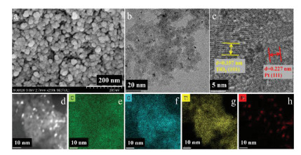 | Fig. 2. (a) SEM images of PI-OMe-TiO2(5.2 wt%); (b) TEM, (c) HRTEM, and (d-h) the elemental mappings image of Pt/PI-OMe-TiO2(5.2 wt%). | |