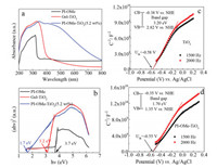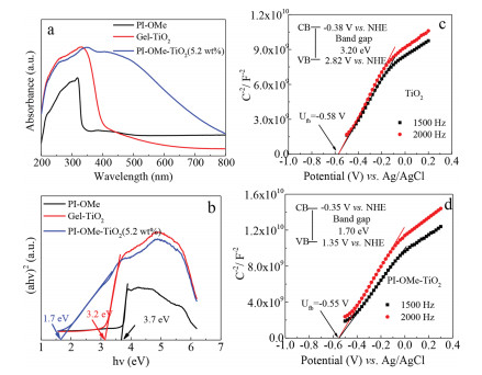 | Fig. 3. The UV–vis absorption (a) and the Tauc plot (b) of PI-OMe, Gel-TiO2 and PI-OMe-TiO2(5.2 wt%). The Mott-Schottky plot of Gel-TiO2 (c) and PI-OMe-TiO2(5.2 wt%) (d). | |