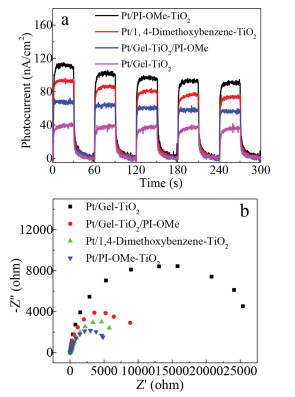 To confirm the synergistic effects of the PI-OMe and TiO2, we first prepared a material by mechanically mixing Gel-TiO2 and PI-OMe (5.2 wt%) (denoted as Gel-TiO2/PI-OMe(5.2 wt%)) and then loaded 1.5 wt% Pt nanoparticles on the surface of the mixture. The hydrogen production of the materials was only 0.0046 mmol g−1 h−1, which was approximately 260 times lower than the Pt/PI-OMe-TiO2(5.2 wt%), even though they had the same components with the same weight percentages. In addition, the control group of 1,4-dimethoxybenzene-TiO2 (4.8 wt%) loaded with 1.5 wt% Pt nanoparticles was also tested for hydrogen production by photocatalytic splitting from water. Only a trace amount of H2 was produced within 5 h. These results demonstrated that the high photocatalytic activity of the Pt/PI-OMe-TiO2(5.2 wt%) was not only due to the components in the materials but also the unique spatial structure and the electrons storage capacity of PI-OMe. The cooperativity of the two components at the systems level resulted in the more efficient charge separation and transfer for the photocatalysis.