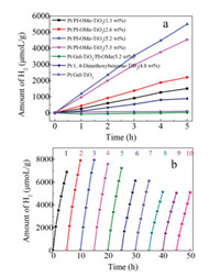 | Fig. 4. (a) The photocatalytic performence of PI-OMe-TiO2 with different PI-OMe contents for H2 production; (b) Photocatalytic H2 production over the recyclability of PI-OMe-TiO2(5.2 wt%) in 20 mL H2O/TEOA (9:1, v/v) with 0.5 wt% Pt loading under visible light irradiation (λ > 420 nm). | |