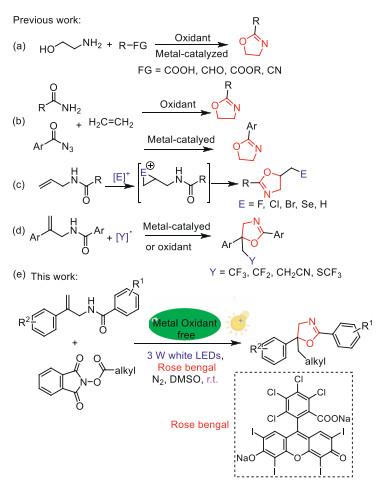 Nitrogen-containing heterocyclic compounds with unique biological and pharmacological activities are usually used as structural units of drugs and pesticides [1-9]. As a kind of N-heterocycle, oxazolines exhibit various notable bioactivities, such as antimicrobial, antimalarial, antiviral, antioxidant, antitumor (Fig. 1) [10-13]. The traditional methods for synthesis of oxazolines are realized via the condensation of β-aminoalcohols with carboxylic acids, aldehydes, esters or nitriles (Scheme 1a) [14]. Additionally, [2 + 3] cyclization of olefins and amides (or benzoyl azides) is an efficient strategy for the synthesis of oxazolines (Scheme 1b) [15, 16]. Furthermore, allylic amide cyclization reaction provides a reliable approach to obtain oxazolines which focused on a halocyclization reaction with cationic halogen to form five-membered heterocycles (Scheme 1c) [17-20]. Recently, the cyclization of allylic amide based on radical coupling has become a new strategy for preparation of oxazolines (Scheme 1d) [21-25]. Although these processes are essential, some drawbacks such as hard conditions, the use of large amounts of metal complexes and oxidants, substrate limitations, still limit the further application.