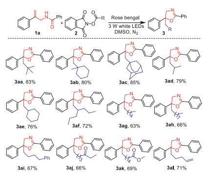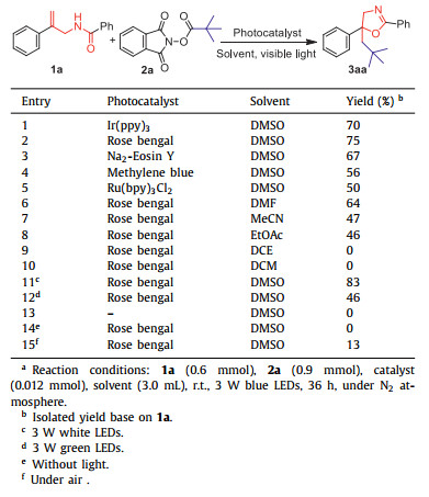To begin our study, N-(2-phenylallyl)benzamide 1a and t-butyl NHP esters 2a were utilized as model substrates to optimize the reaction conditions. Initially, the transformation was studied with Ir(ppy)3 as a photocatalyst, irradiated with 3 W bule LEDs in DMSO under N2 atmosphere for 36 h. Fortunately, the target 5-neopentyl-2,5-diphenyloxazoline 3aa was formed in 70% yield (Table 1, entry 1). In order to increase the yield of desired product, a variety of photocatalysts such as Rose bengal, Na2-Eosin Y, methylene blue, Ru(bpy)3Cl2 were investigated (Table 1, entries 2–5). The experiment results revealed that only Rose bengal exhibited a better efficiency with a yield of 75%. Subsequently, a variety of commonly used solvents including DMF, MeCN, EtOAc, DCE, DCM were screened (Table 1, entries 6–10). Disappointingly, the yield was decreased when DMF, MeCN, EtOAc were employed, and no product was found with DCE or DCM as solvent. Thus, DMSO is still the most suitable solvent. To further improve the efficiency of this transformation, 3 W blue LEDs were replaced by white or green LEDs (Table 1, entries 11 and 12). To our delight, the yield of 3aa was increased from 75% to 83% as 3 W white LEDs was applied. Contrast experiments indicated that either photocatalyst or visible light is indispensable for this transformation (Table 1, entries 13 and 14). Furthermore, only an extremely low yield was obtained when this reaction was executed under air (Table 1, entry 15).