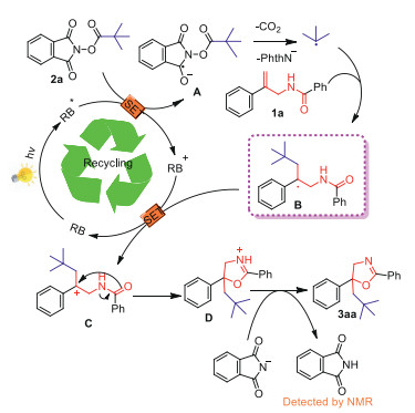 According to the above-mentioned observations and previous literature reports [61], a plausible mechanism for this transformation was proposed in Scheme 5. Initially, the photosensitizer Rose bengal (RB) was irradiated by 3 W white LEDs to form its activated species, which can transfer a single electron to NHP ester 2a to generate the radical A, accompanied by the oxidation of RB* to its oxidative state RB+ (E1/2RB+/RB* = −1.32 V vs. SCE, E1/2 (NHP esters) ≈ −1.26 V vs. SCE) [62, 63]. Then the t-butyl radical was formed via release of carbon dioxide and phthalimide anion from radical A, which was subsequently captured by the double bond in allylic amide to give the radical B. Through a single electron transfer process between RB+ and radical B, the carbocation intermediate C was generated. The desired product 3aa was finally obtained after undergoing an intramolecular cyclization of C between carbocation and carbonyl, followed by a deprotonation process with phthalimide anion.