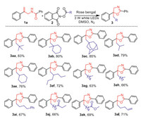 After determining the optimal reaction conditions, including Rose bengal as a photosensitizer at room temperature in DMSO by irradiation of 3 W white LEDs under N2 atmosphere for 36 h, the scope of NHP esters was examined through the radical alkylation/cyclization of 1a. It can be concluded from Scheme 2 that this protocol is applicable to different types of NHP esters, affording the desired products in moderate to excellent yields. Initially, the tertiary alkyl NHP esters containing t-butyl, methylcyclohexyl and adamantyl showed excellent tolerance for this transformation, and gave the desired products 3aa-3ac in excellent yields. Subsequently, secondary alkyl NHP esters were experimented under optimal conditions, and the results exhibited that alkyl NHP esters including isopropyl, cyclohexyl, 3-heptyl were also well adapted to this protocol and the corresponding products 3ad-3af were obtained in 72% to 79% yields. It is worth mentioning that primary alkyl NHP esters which could generate primary alkyl radicals were also suitable well for this protocol. For example, 63%−67% yields can be obtained by taking n-pentyl, n-octane and 3-phenylpropyl as the reactive radicals to participate in the reaction (3ag-3ai). Additionally, the primary alkyl NHP esters containing functional groups involving carbonyl, ester and alkenyl on aliphatic chain are apposite to this transformation and provided the desired product in yields of 66%–71% (3aj-3al).