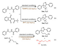In order to explore the reaction mechanism, several control experiments were carried out as shown in Scheme 4. A radical scavenger TEMPO (2,2,6,6-tetramethyl-1-piperidinyloxy) (3.0 equiv.) was applied to the model reaction, and this alkylation/cyclization reaction was totally suppressed (Scheme 4a). The same result was obtained when using BHT as another radical scavenger in the same system (Scheme 4b). These results revealed that the transformation might be carried on with a radical mechanism. To confirm the existence of alkyl radical, 1,1-diphenylethylene was added into the transformation between NHP ester and allylic amide under the standard conditions, the adduct 4 was obtained as the only product in a yield of 33% (Scheme 4c). Furthermore, EPR experiment was performed and strong signal peaks of alkyl radical adduct with DMPO were detected (for details, see Supporting information).