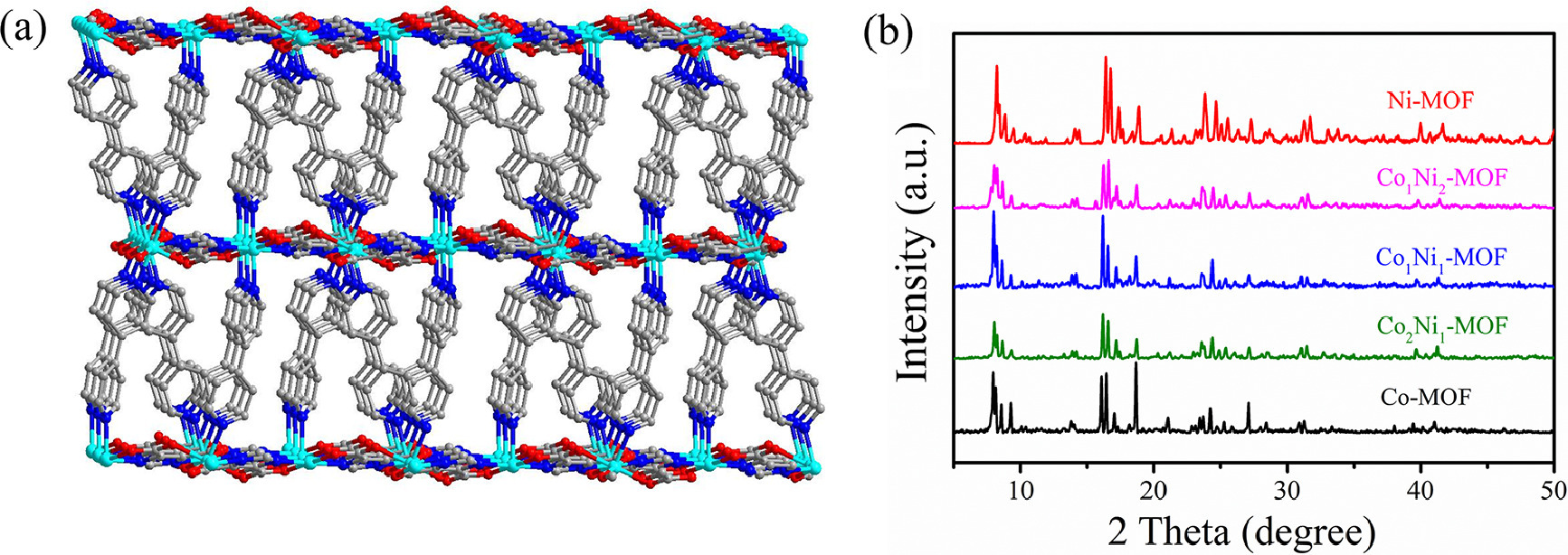 | Fig. 1. (a) Three-dimensional pillar-layered structure of CoxNiy-MOFs; (b) PXRD patterns of CoxNiy-MOFs. | |