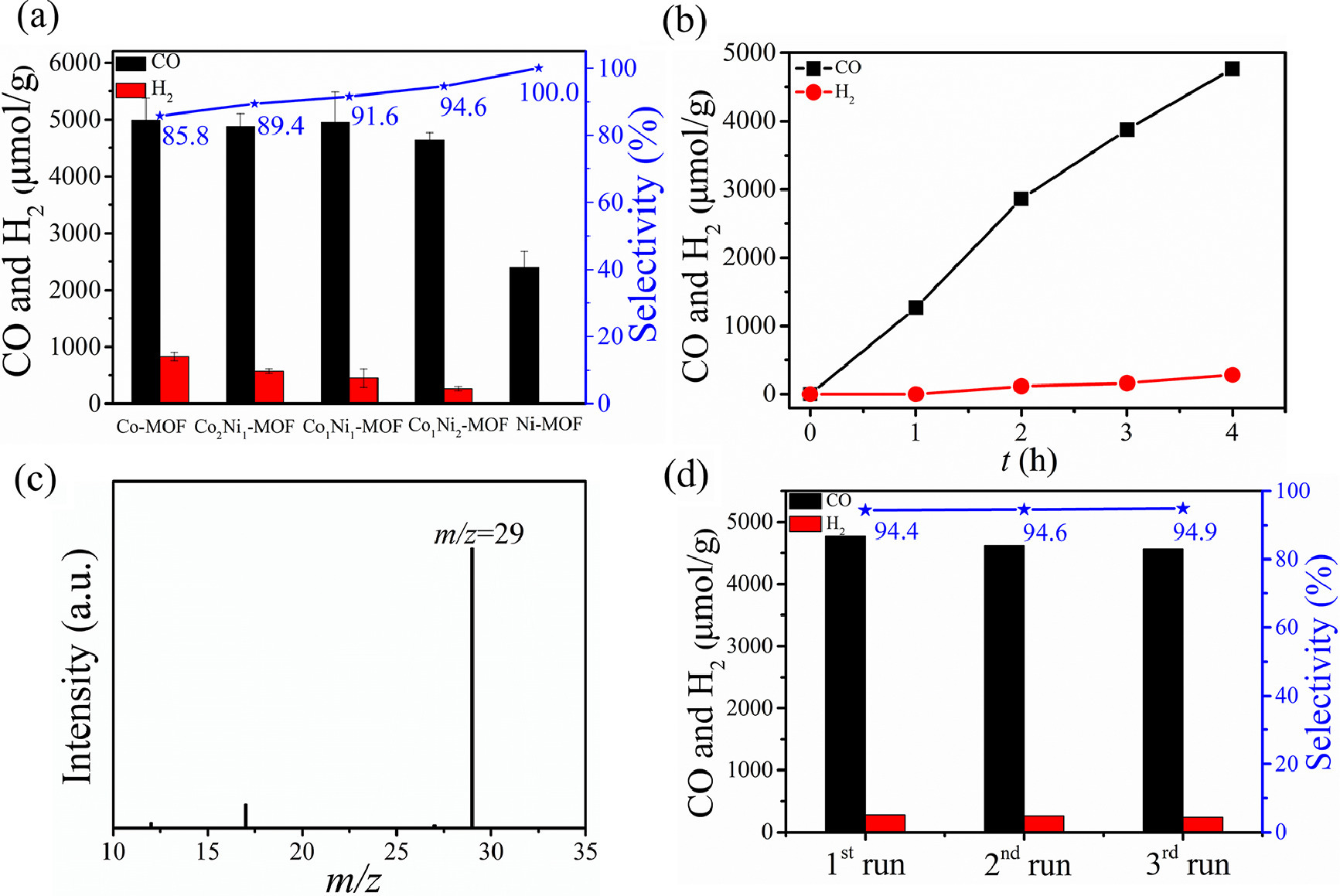 | Fig. 2. (a) Photocatalytic CO2 reduction with CoxNiy-MOFs; (b) Time profile of CO and H2 evolution rate, (c) Mass spectrum of the gas generated from photocatalytic CO2 reduction by using 13CO2, (d) Cycle experiments of Co1Ni2-MOF for photocatalytic CO2 reduction. Reaction conditions: catalyst (2 mg), [Ru(phen)3](PF6)2 (0.43 mmol/L), TEOA (0.3 mol/L), CH3CN/H2O (v/v = 4:1; 5 mL), 300 W Xe lamp (λ > 420 nm), 4 h, 25 ℃. | |