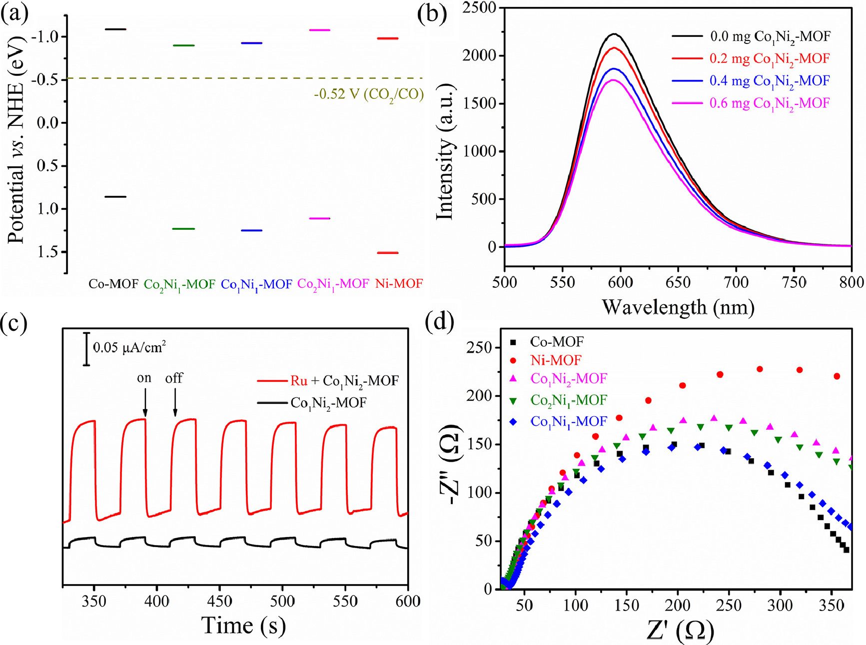 | Fig. 3. (a) The band structures of CoxNiy-MOFs; (b) Steady state fluorescence spectra of [Ru(phen)3]PF6 upon the addition of Co1Ni2-MOF; (c) Photocurrent response of Co1Ni2-MOF and Co1Ni2-MOF containing [Ru(phen)3]PF6; (d) Nyquist plots of CoxNiy-MOFs. | |