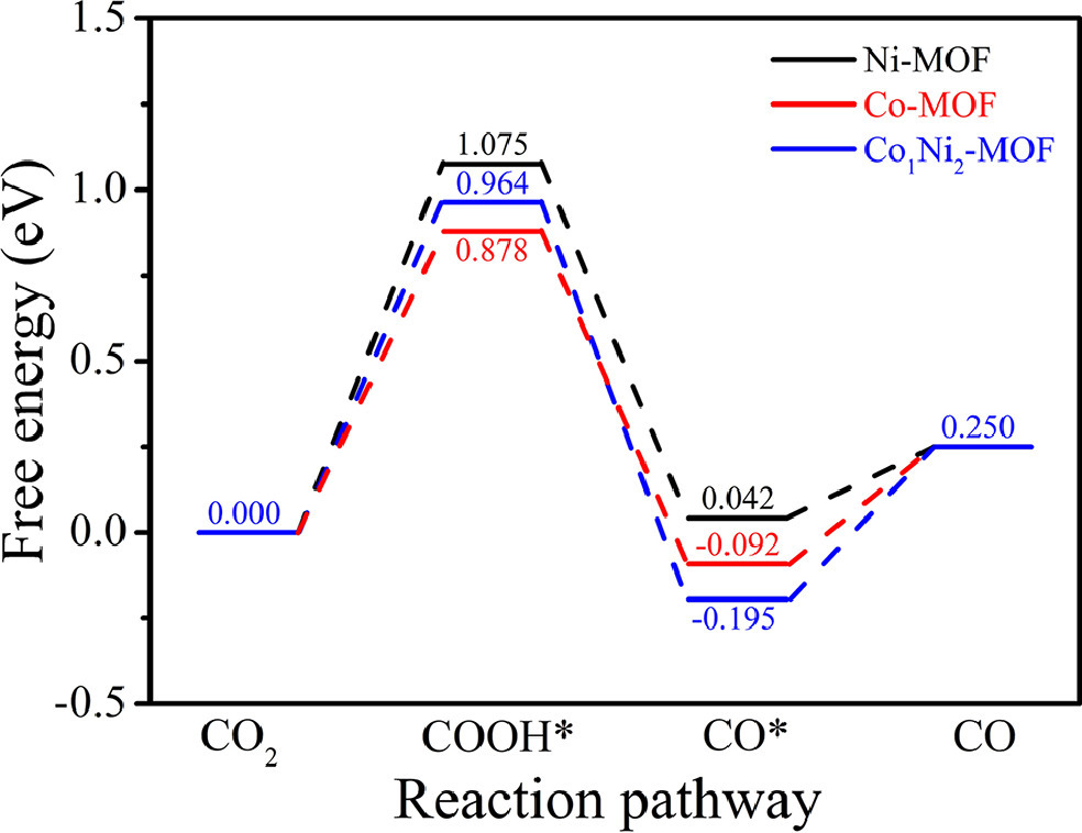 In summary, a series of isostructural CoxNiy-MOFs based on H3IDC and 4, 4ʹ-bpy were synthesized for photocatalytic CO2 reduction. The experimental and DFT calculation results reveal that bimetallic strategy is an effective way to optimize the photocatalytic performance of Co-MOF. The optimized bimetallic Co1Ni2-MOF exhibits remarkably enhanced photocatalytic performance for CO2–to–CO conversion, with an evolution rate of 1160 µmol g−1 h−1 and a high selectivity of 94.6%, superior to those of monometallic Ni-MOF and Co-MOF. This work paves a new way for developing high-performance MOFs-based catalysts for photochemical CO2 reduction.