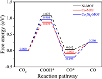 DFT calculations were further performed to understand the catalytic performance of Ni-MOF, Co1Ni2-MOF and Co-MOF for the conversion of CO2 to CO (Fig. S33 in Supporting Information). The proposed reaction pathways and the corresponding free-energy diagrams are shown in Fig. 4. First, the CO2 molecule undergoes a proton coupled electron transfer (PCET) process to form the COOH* intermediate (asterisk denotes an adsorption status), which is generally regarded as the rate-limiting step. The free energy change (∆G) for this step over Ni-MOF, Co1Ni2-MOF and Co-MOF is 1.075, 0.964 and 0.878 eV, respectively. The results demonstrate that Co-MOF and Co1Ni2-MOF have appropriate ∆G values in the rate-limiting step, while Ni-MOF exhibits a relatively higher ∆G value. Then, the COOH* intermediate undergoes the second PCET process, forming *CO and a H2O molecule. The ∆G values for this step over the three catalysts are negative (–1.033, –1.159 and –0.970 eV, respectively), indicating this step is spontaneous. Finally, the CO desorbs from the catalyst surface. For Ni-MOF, Co1Ni2-MOF, and Co-MOF, the CO desorption is slightly endothermic (0.208, 0.445 and 0.342 eV, respectively). Overall, the DFT calculations show that Co-MOF and Co1Ni2-MOF have better catalytic capacity for CO2 to CO conversion than Ni-MOF, which well supports the experimental results.
