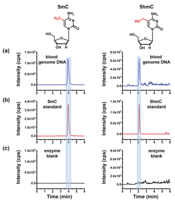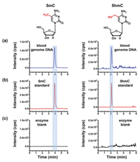 | Fig. 2. Extraction-ion chromatograms of 5mC and 5hmC. (a) 5mC and 5hmC detected from peripheral blood DNA. (b) 5mC and 5hmC standards. (c) Enzyme blank for 5mC and 5hmC. The enzyme blank represents the sample only containing the enzymes used for digestion and omitting the DNA. | |