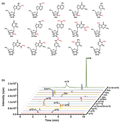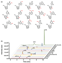 | Fig. 3. The chemical structures (a) and extraction-ion chromatograms of the standards (b) of 15 RNA modifications. | |