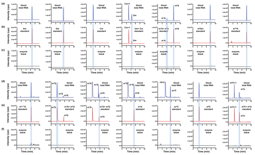 | Fig. 4. Extraction-ion chromatograms of RNA modifications of Am, Gm, Cm, Um, m1A, m6A, m6Am, m6, 6A, m2, 2, 7G, m7G, m2G, m1G, ac4C, m5C and m3U. (a, d) Detected RNA modifications from peripheral blood RNA. (b, e) Nucleoside standards. (c, f) Enzyme blank for these RNA modifications. The enzyme blank represents the sample only containing the enzymes used for digestion and omitting the RNA. | |