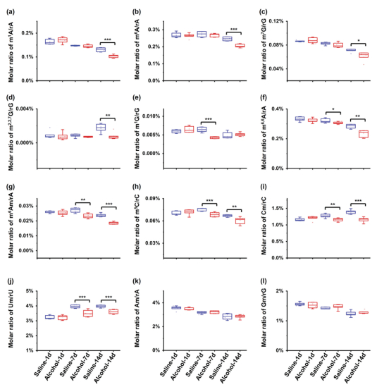 | Fig. 6. Content changes of 12 RNA modifications in rat peripheral blood RNA upon alcohol exposure. *, P < 0.05; **, P < 0.01; ***, P < 0.001. | |