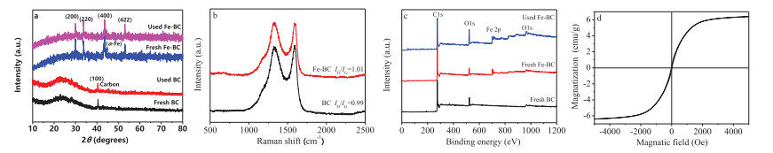 | Fig. 1. XRD patterns of BC and Fe-BC before and after reaction (a), Raman spectra (b) and XPS survey of BC, Fe-BC and used Fe-BC (c), and magnetic hysteresis loops of Fe-BC (d). | |